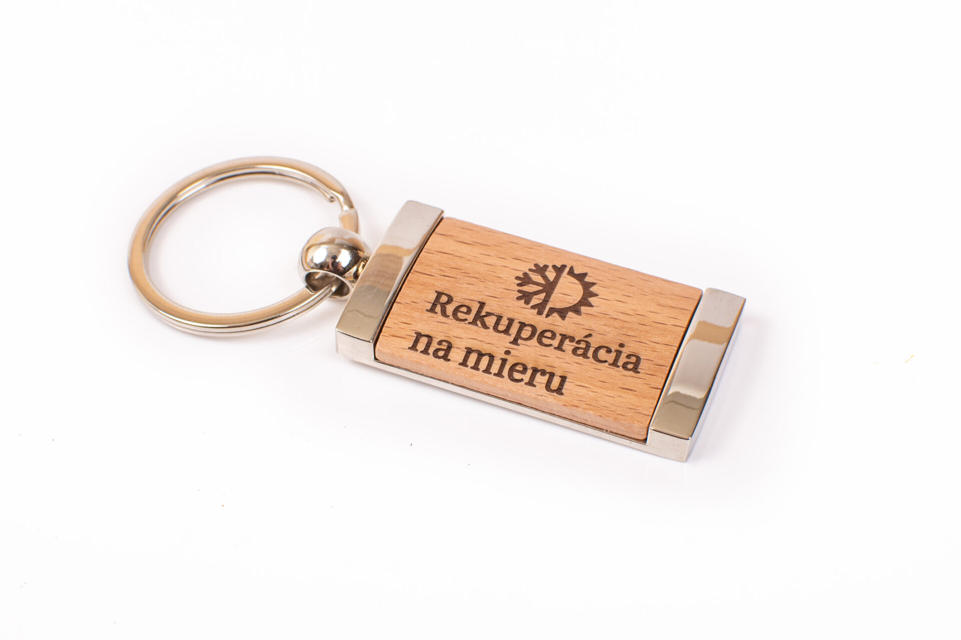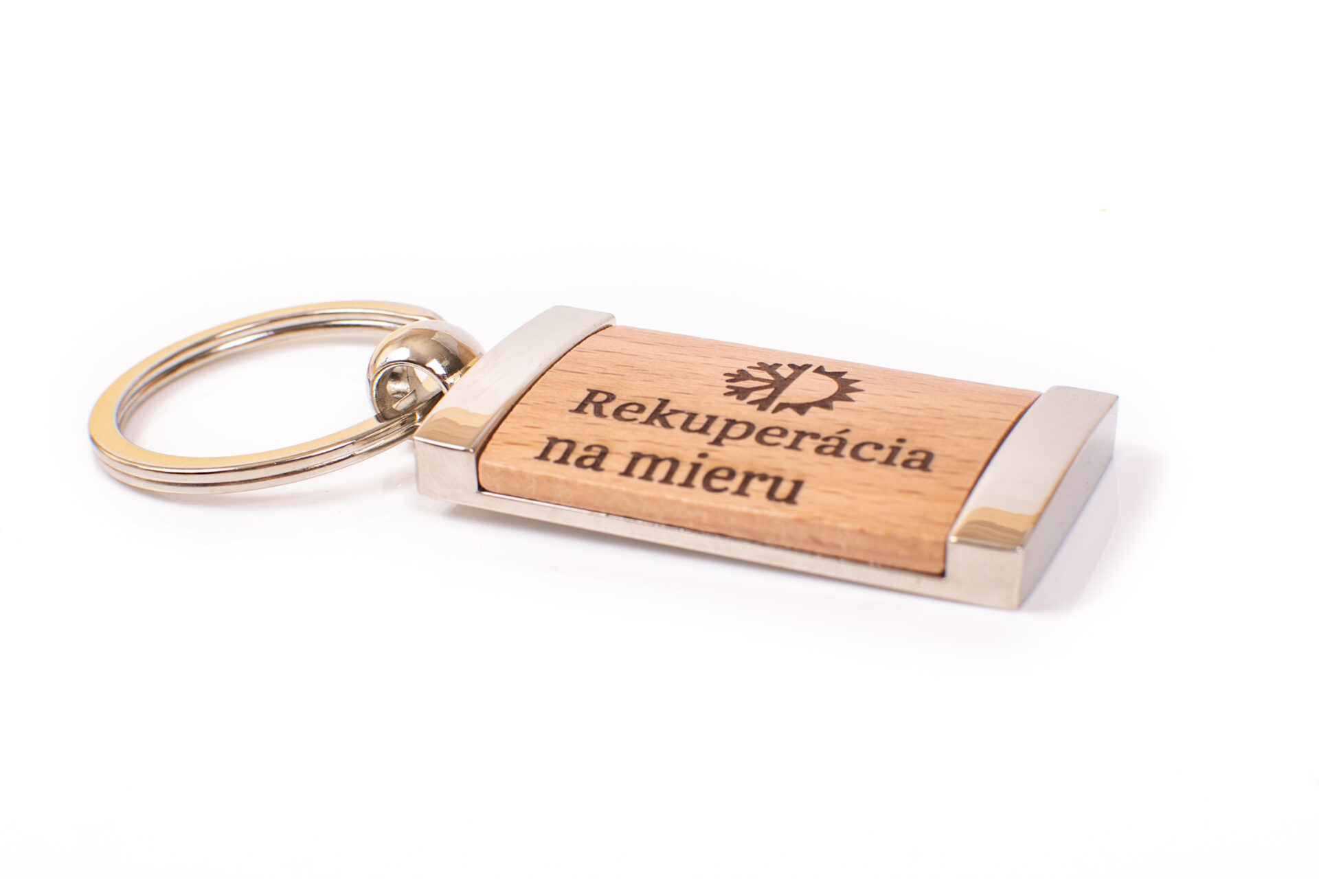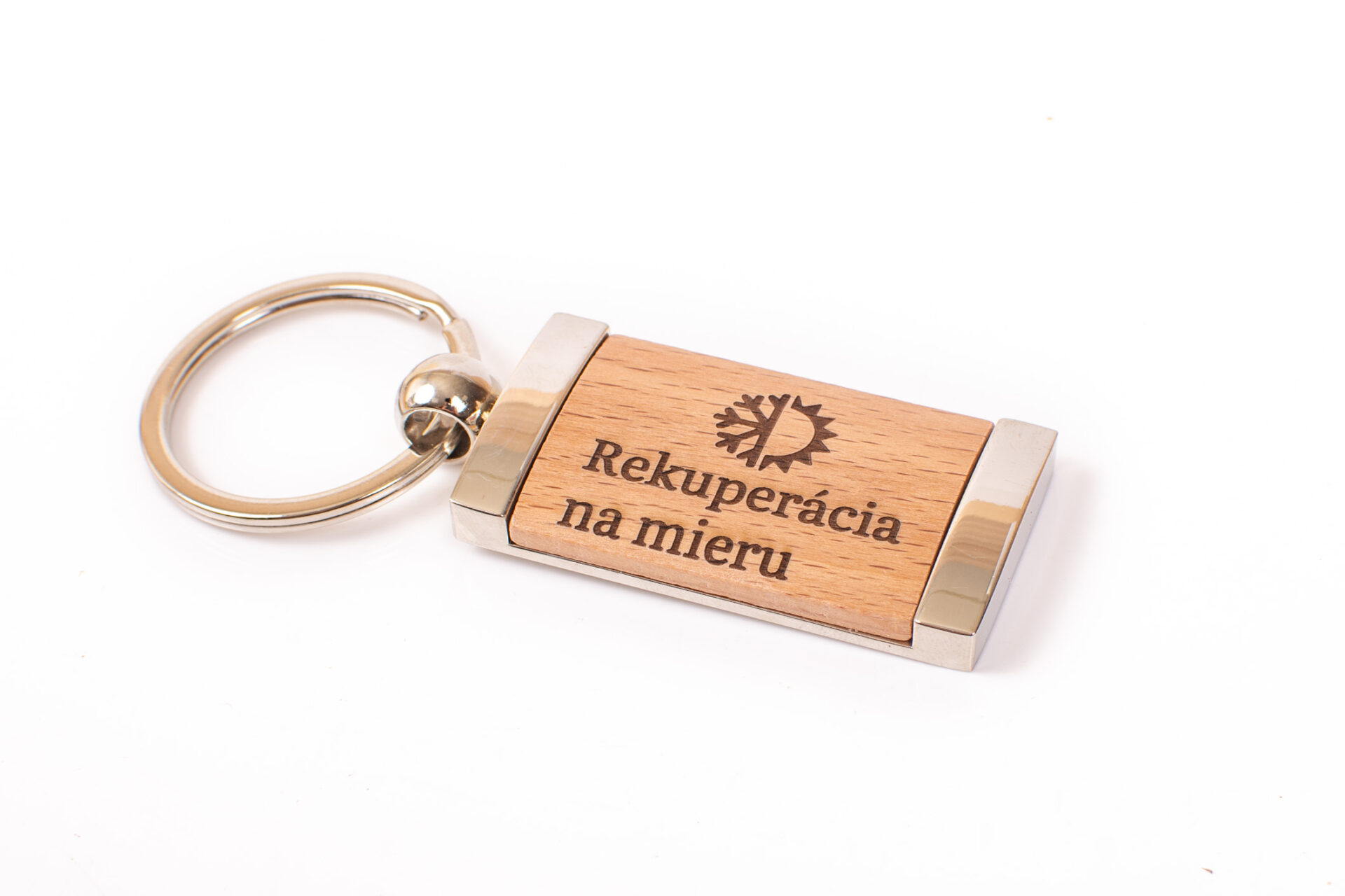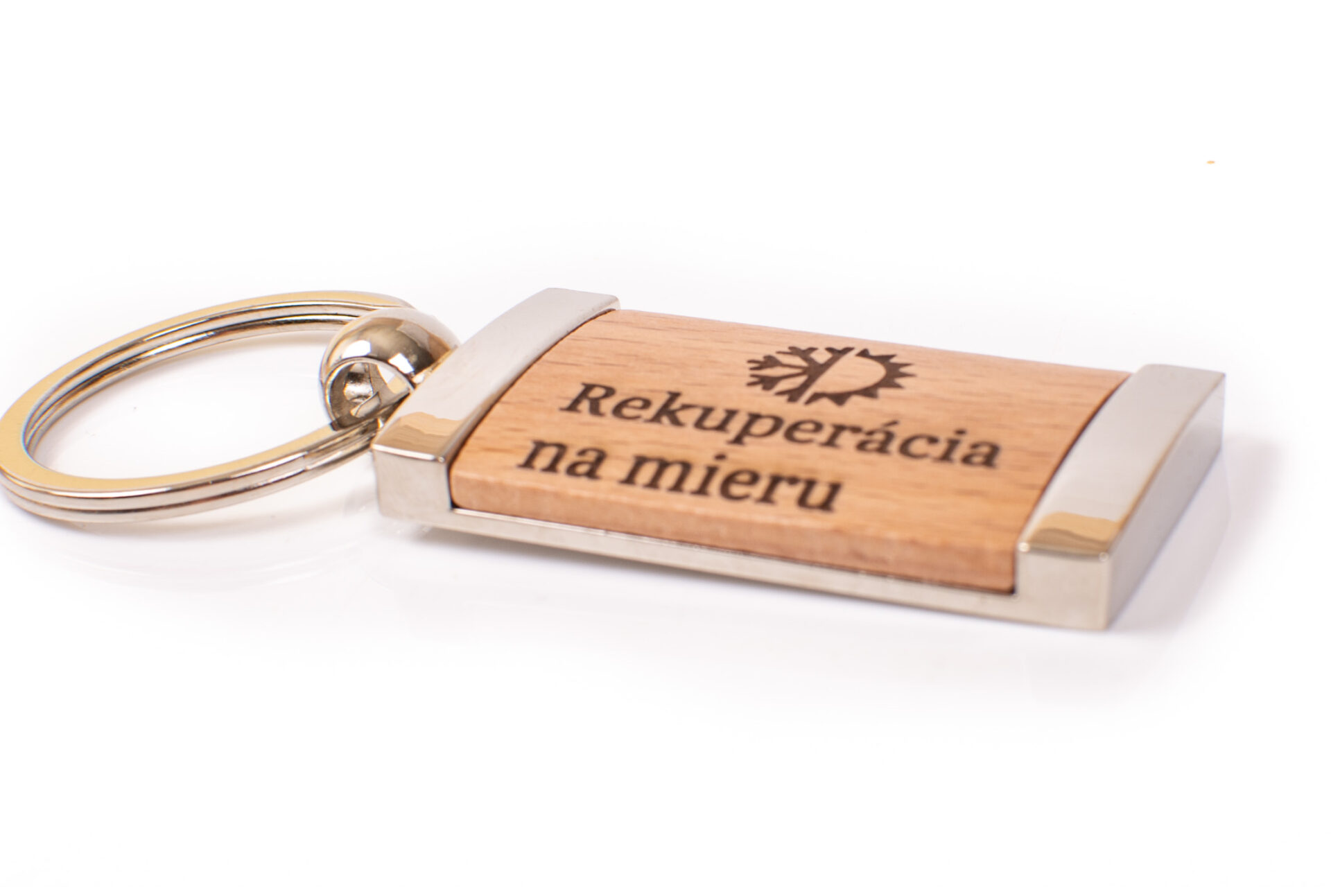 Drevená, kovová kľúčenka s gravírovaným logom firmy