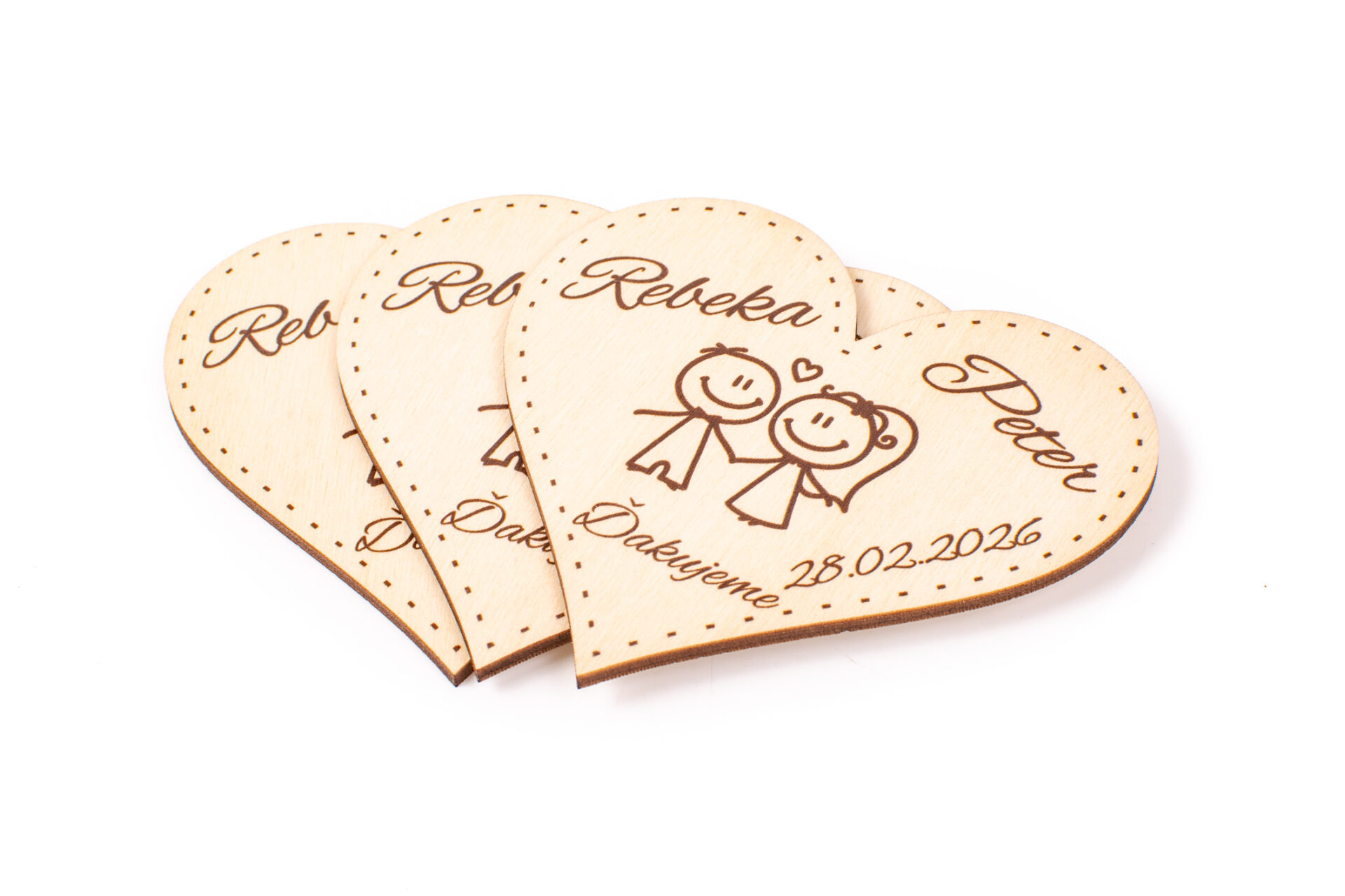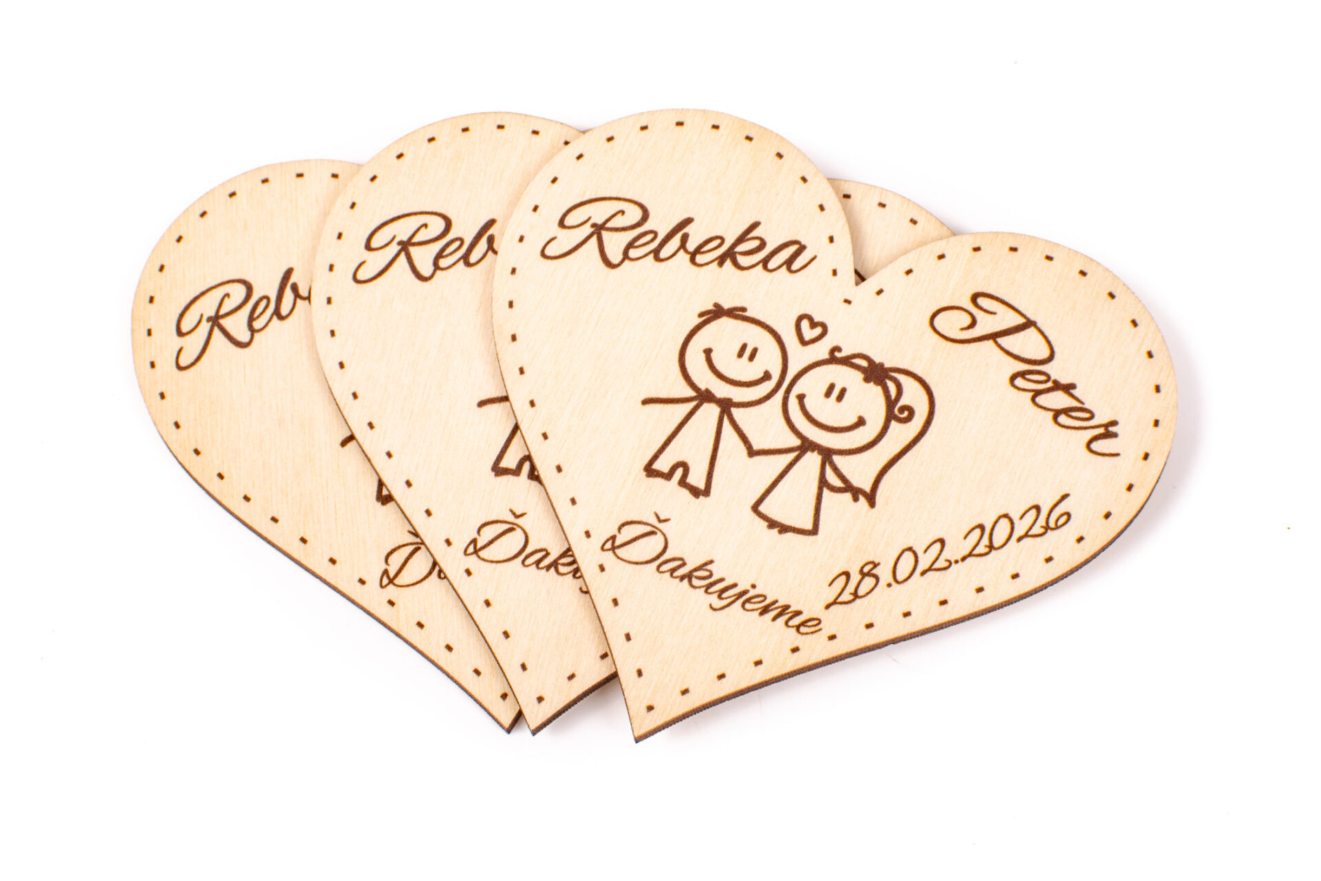Svadobné magnetky sú úžasným spôsobom, ako sa podeliť o vašu lásku a šťastie s vašimi svadobnými hosťami. Tieto drevené magnetky v tvare srdca sú zdobené krásnou ilustráciou mladomanželov a sú personalizované s dátumom a menami mladomanželov. Sú ideálnym spôsobom, ako potešiť vašich hostí a poskytnúť im trvalú pamiatku na váš špeciálny deň. Tieto magnetky sú nielen krásnym doplnkom k dekorácii, ale aj skvelým darčekom pre vašich blízkych.